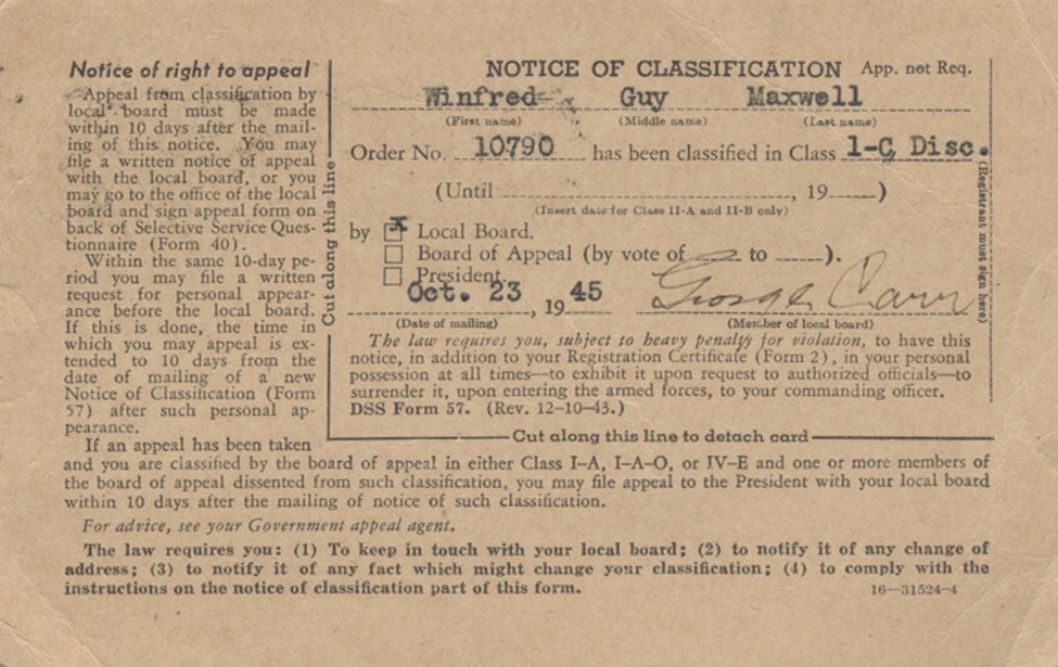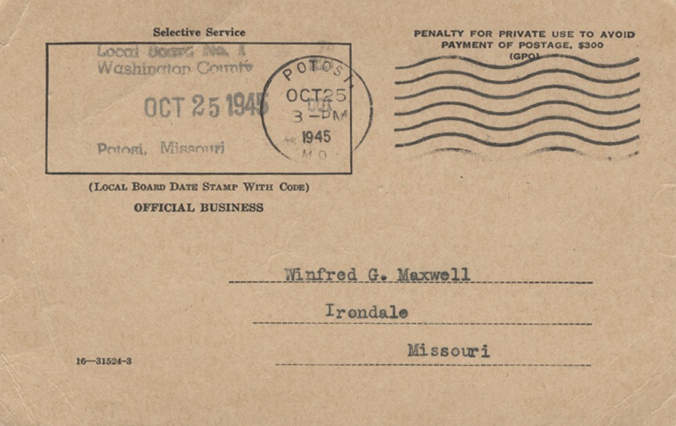 Below is a Classification Notice dated Oct. 23, 1945 (postmarked Oct. 25, 1945) sent to Winfred at home by the local Washington County, MO. Selective Service Board showing that Winfred has officially been reclassified as 1-C Discharged.